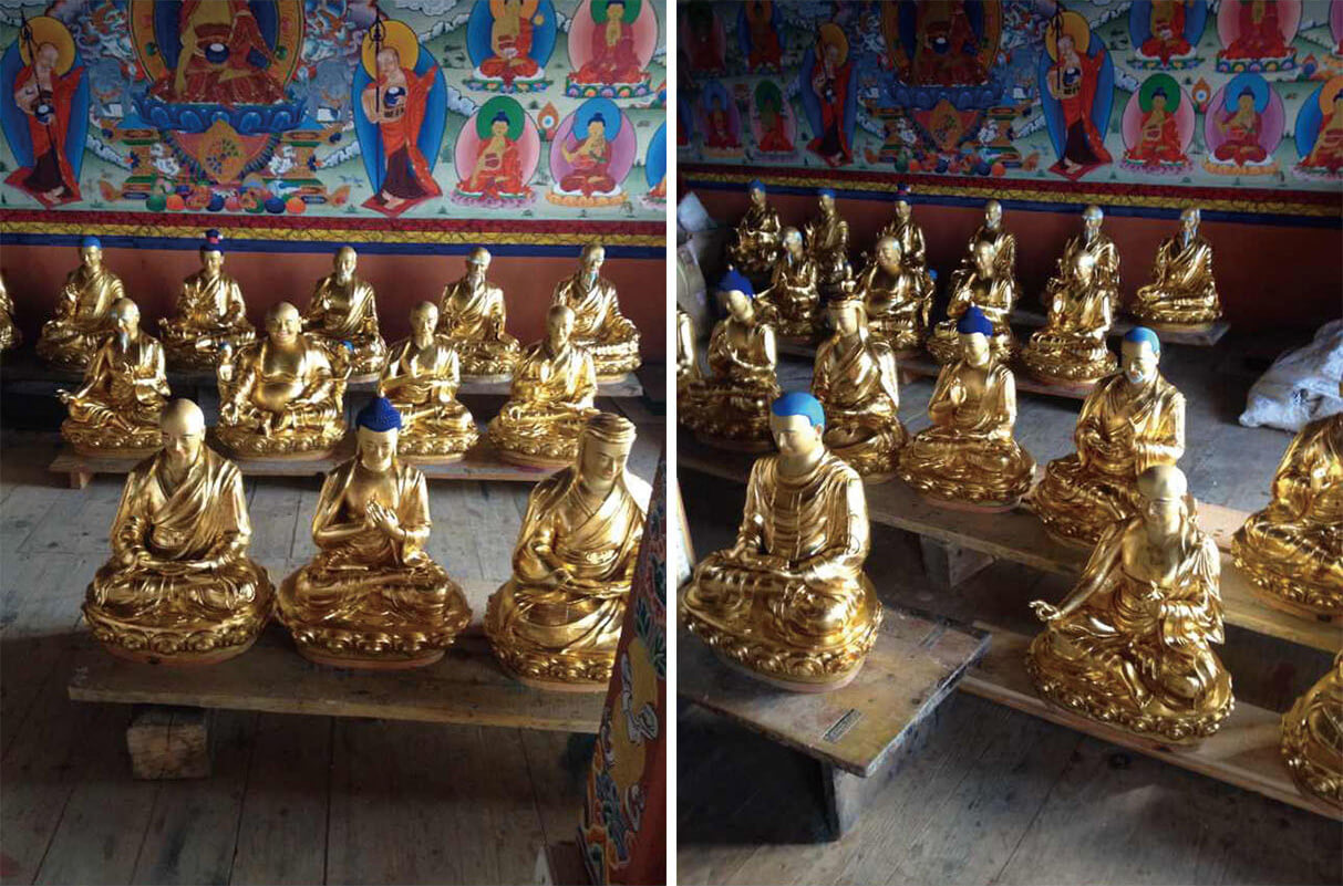 The statues of 16 Arhats were made by the artist ”Karma” whose teacher made the model of Pervasive Knowledge of Longchen Rabjampa with his pure mind and skills, and the 16 Arhats’ model was made of medical herb clay.