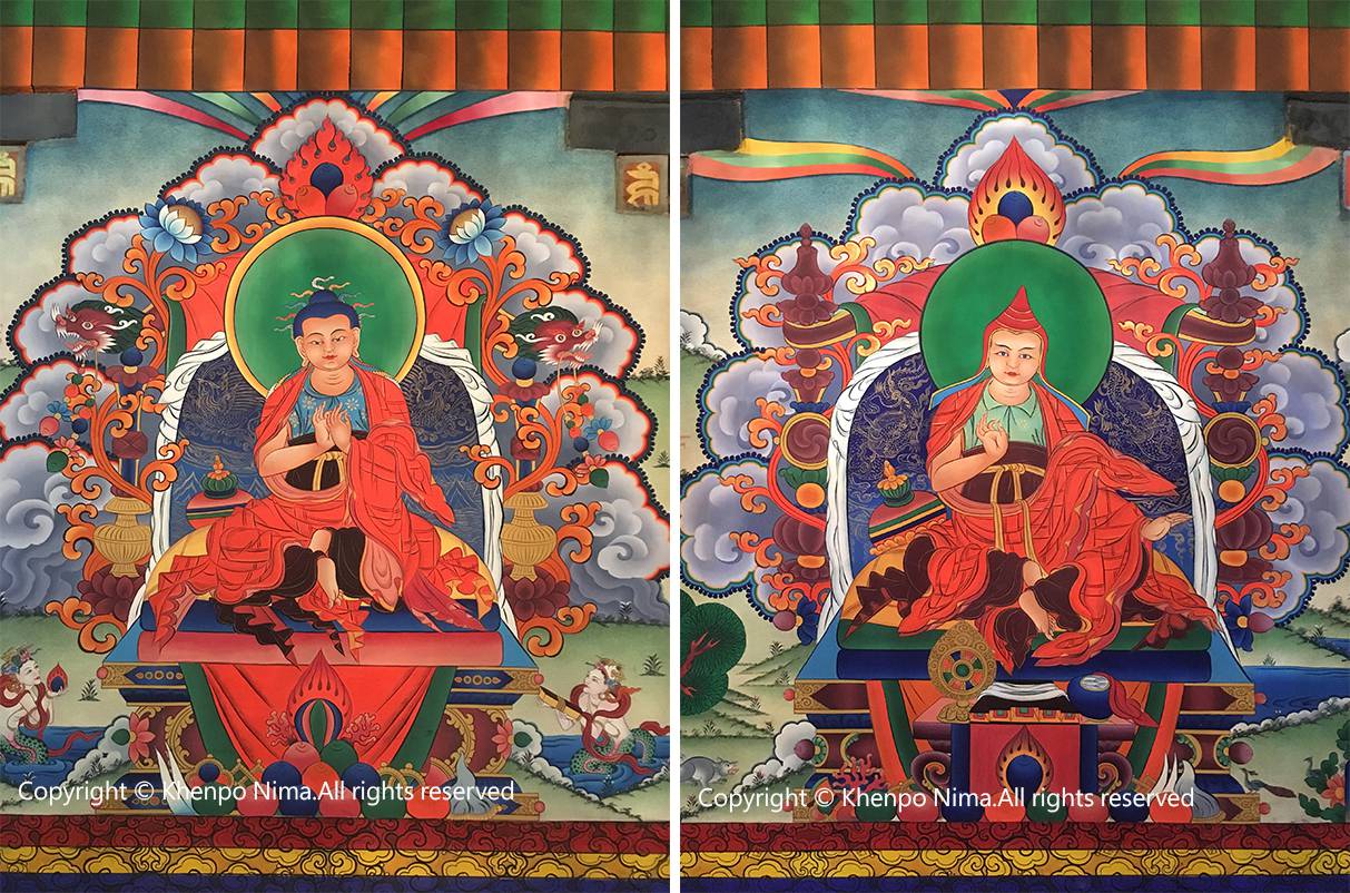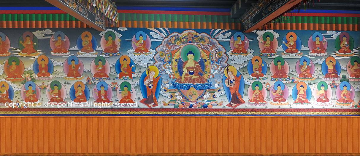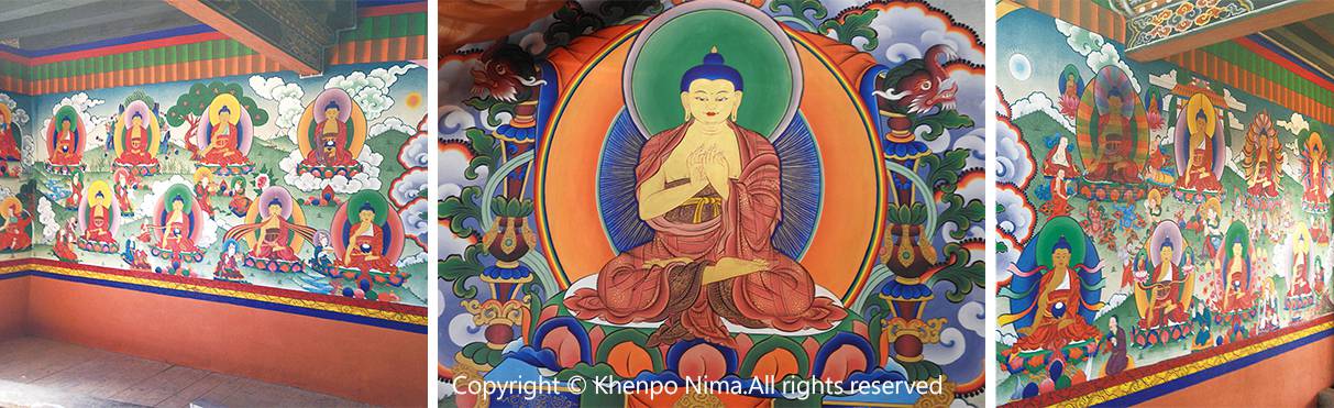 Mural paintings include the master Bhagavan, transforming image in each day from 1stJanuary till 15th January of Tibet calendar and the 35 Confession Buddhasin the Sutra of the Three Heaps. Nagarjuna who is representing the master of deep path of dharma, Arya Asanga who is representing expanded path of Buddhism. They are the two arya masters of Mahāyāna Buddhism in Jambudvipa.