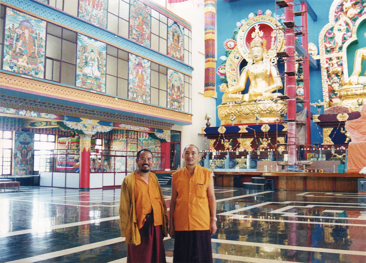 The photo was taken with my good friend “Ngawang” in the grand hall of the Namdroling Monastery which has three floors’mural paintings. He painted the 3rd floor’s mural paintings which are the 12 masters of Dzogchen with his vows. I spent two years to finish painting the 1st and 2nd floors’mural paintings. With the vows devoting myself to the teachings, I adhered to the orders of H.H.Penor Rinpoche and regarded it as a meaningful work and a good opportunity which can purify my obstacles. So, I always did my best.