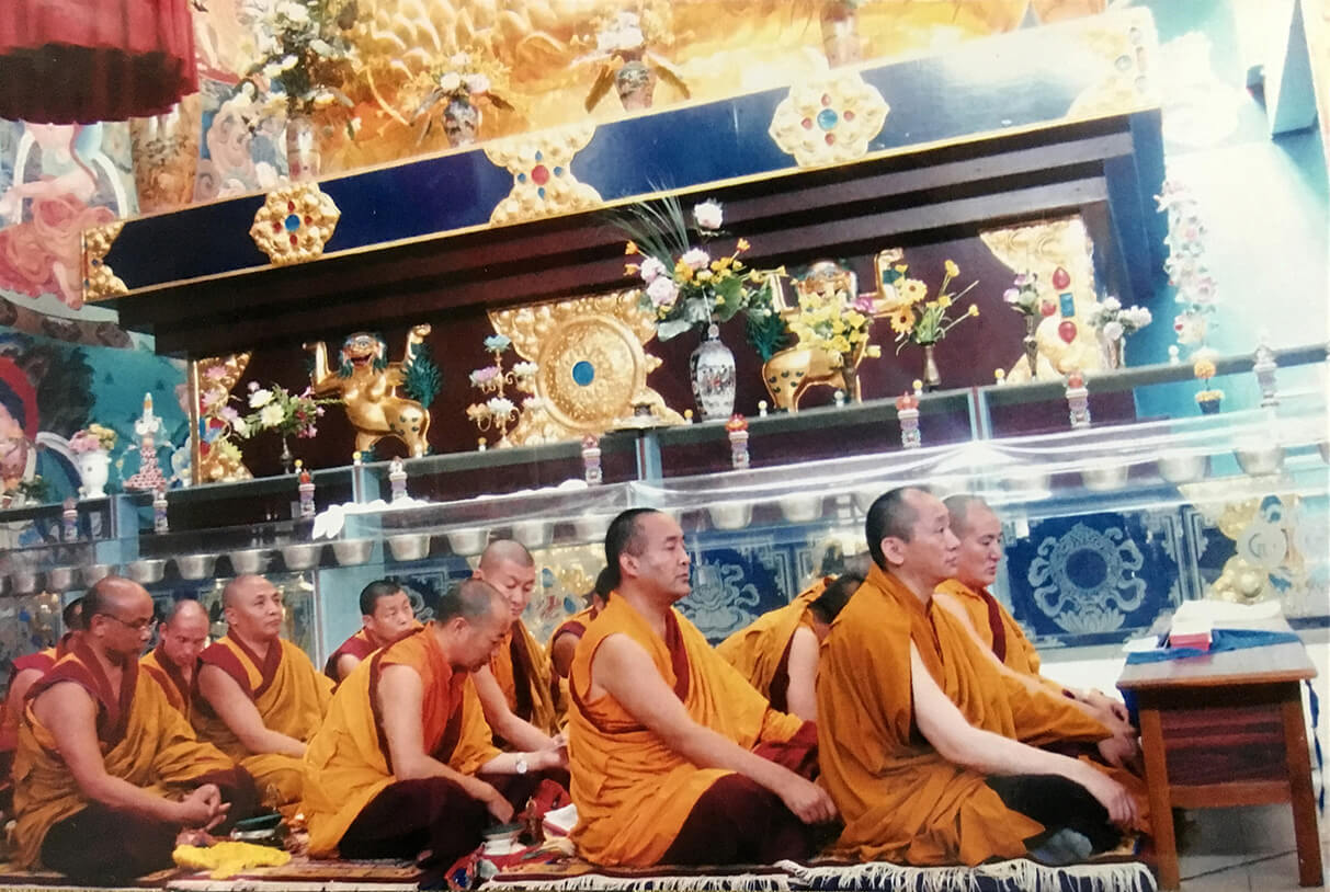 在我卅七歲時,完成九年學業,隨即肩負起不丹「塔巴林寺」佛學院堪布的職責,前後凡四年。後來,又回到南卓林寺,以繪製大雄寶殿的壁畫做為服務,並在佛學院裡教書。如此大概又過了三年。此後,於1999年,我位列南卓林寺「高等學院經咒明覺生源洲」的第三期九位堪布之一;依怙主尊者對我們說了許多勸勉、表揚的話,拔擢我們成為堪布,訓誡道:「要執持、守護、發揚佛法。此外,講修的事業輪,隨時都不容怠慢。」