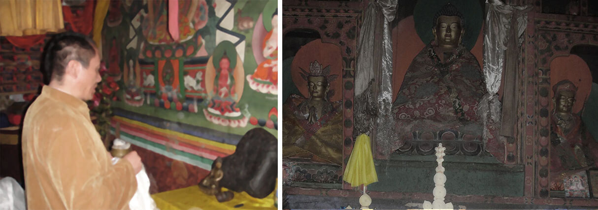 Guru Rinpoche’s “ Black Heaven Stone” with his right footprint in front of it and his left handprint in back of it, a stone molded by his left hand into a fist shape and the three kayas statues are enshrined and worshipped in the temple. They are the treasure of the temple.